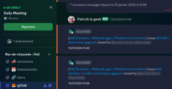 En-dehors des Daily Meetings, nous communiquions via un serveur Discord qui, en plus de nous fournir un endroit pour discuter, nous tenait à jour sur ce qu'il se passait sur GitLab et sur les prochaines réunions prévues, grâce à des intégrations.